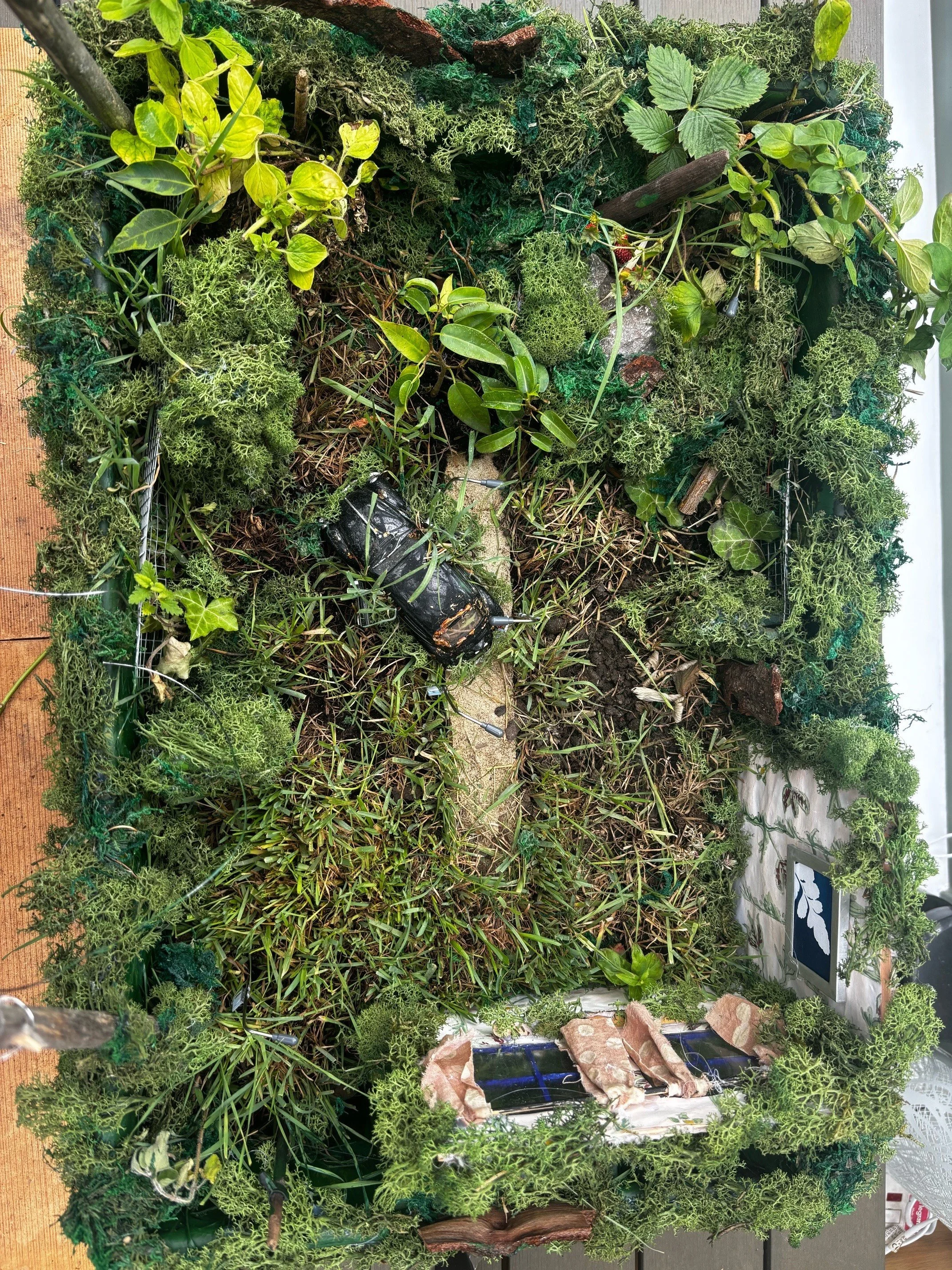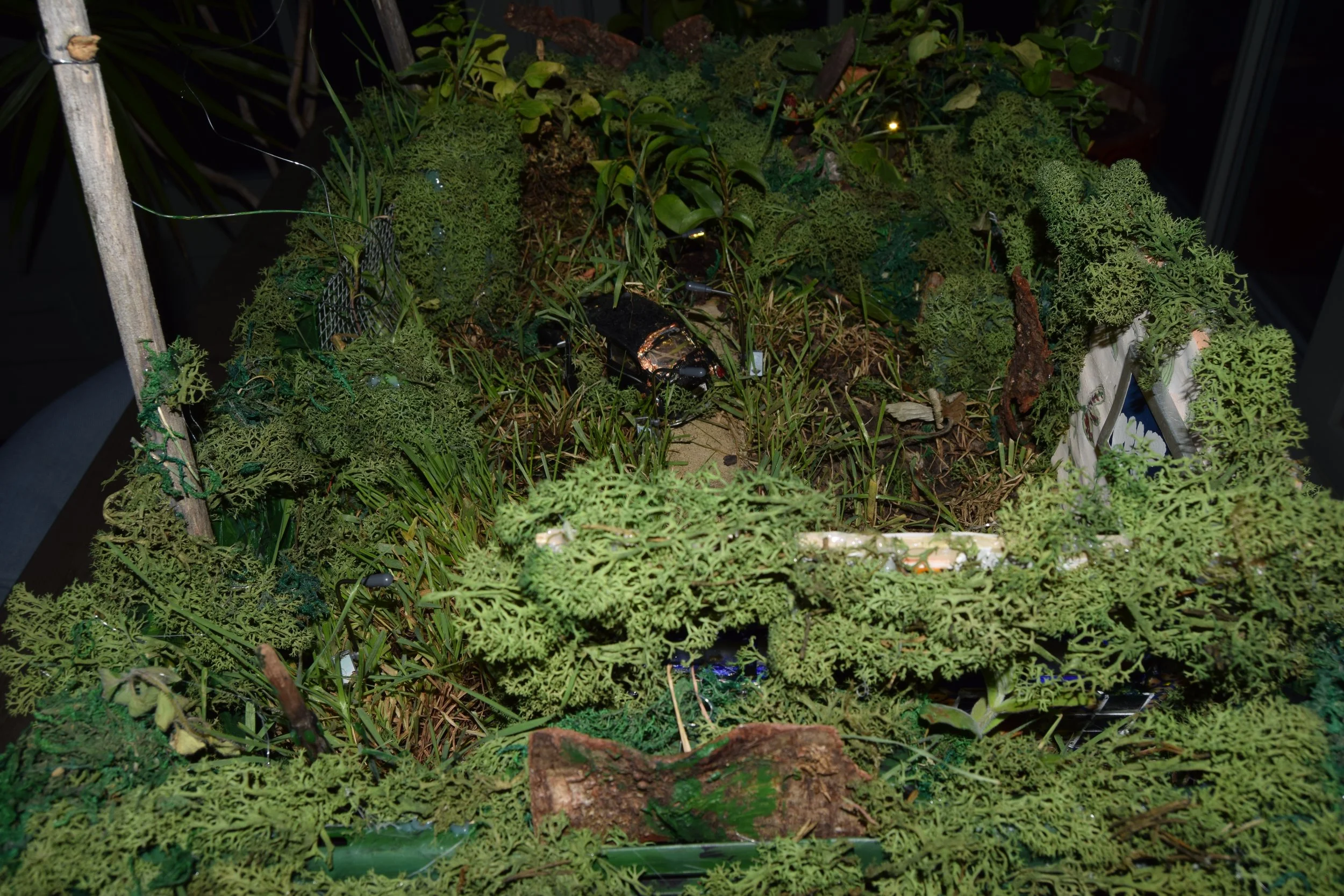 Qu’est-ce que c’est? was a living installation that invited more questions than it answers by drawing observers in to participate and immerse themselves in an environment that offers a representation of a home being devoured by nature’s reclaiming of territory. Set within a physical boundary of a devastated dystopian forest, many aspects of that abandoned home are visible. But what happened?